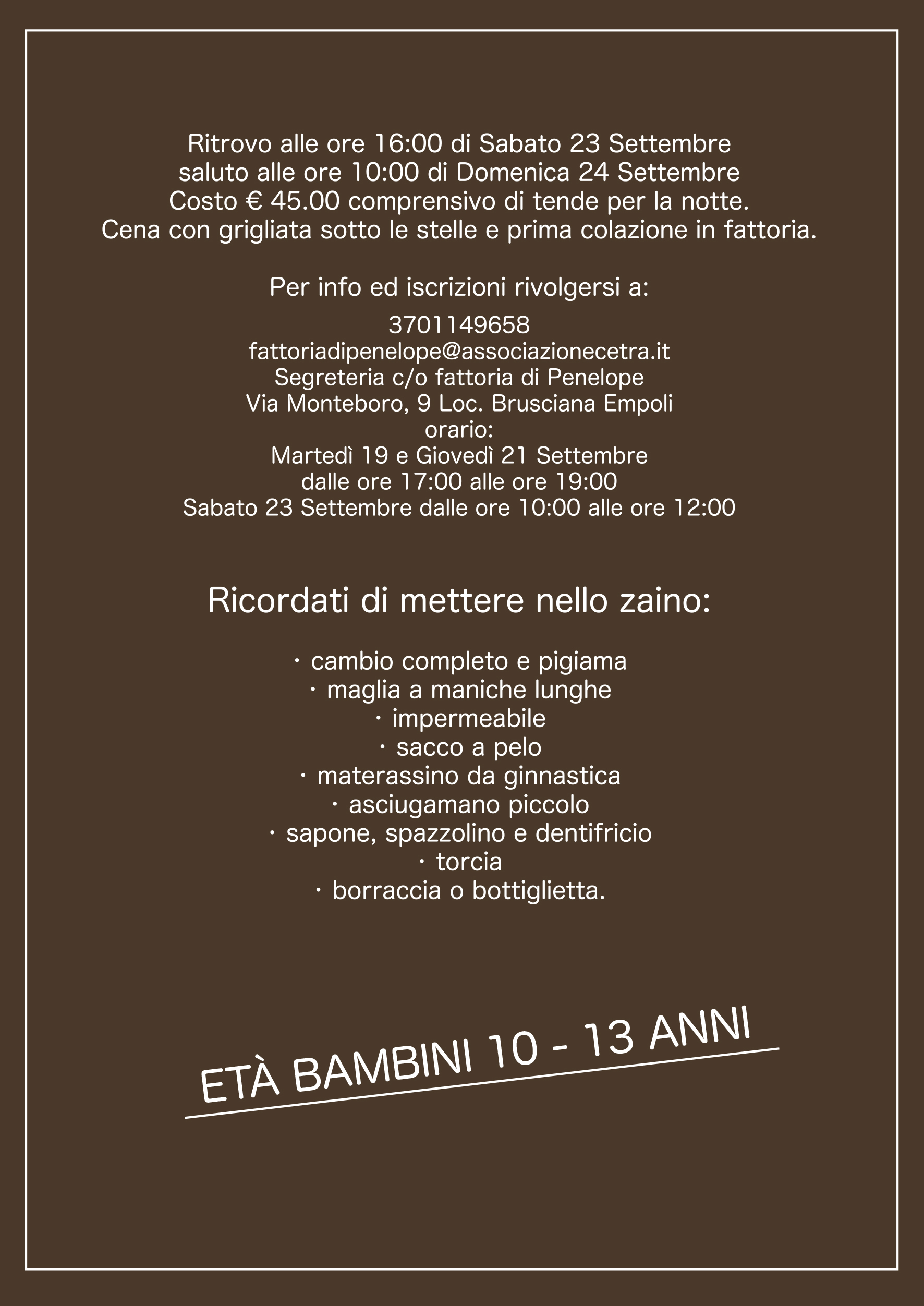Le iscrizioni sono aperte presso la Fattoria didattica di Penelope nei giorni di martedì 19 e giovedì 21 settembre dalle ore 17.00 alle ore 19.00 e sabato 23 dalle ore 10.00 alle ore 12.00. Per informazioni potrete contattare il numero 3701149658 oppure scrivere a fattoriadipenelope@associazionecetra.it