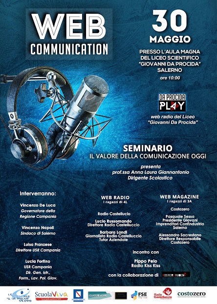 SALERNO. Il giorno 30 maggio 2017 il Liceo Scientifico “Giovanni Da Procida” presenta alle ore 10,00 presso l’aula magna il seminario “#WEB COMMUNICATION: WEB RADIO E WEB MAGAZINE: Il valore della comunicazione oggi”,manifestazione conclusiva del percorso Scuola Viva, progetto POR Regione Campania FSE POR Campania FSE 2014/2020 – D.D. 229 del 29/06/2016.