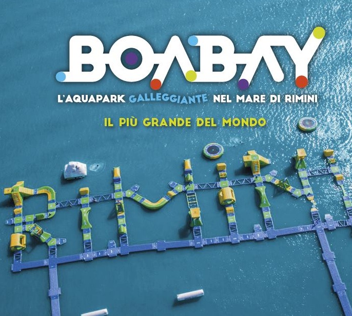 BoaBay, il primo parco galleggiante nel mare di Rimini, riapre i battenti GIOVEDÌ 1° GIUGNO 2018 per la sua terza stagione carica di adrenalina. Composto da gonfiabili modulari che creano la scritta RIMINI, visibile anche dal satellite, BoaBay è situato a 100 metri dalla spiaggia davanti ai Bagni dal 47 al 62 di Rimini che costituiscono il consorzio de Le Spiagge Srl (www.lespiaggerimini.it): situate in una delle aree più centrali di Rimini, Le Spiagge rappresentano un network unico in grado di offrire ai turisti innumerevoli servizi - dai campi di beach games alle aree gioco per i bambini, palestre attrezzate, zone benessere, noleggio natanti e molto altro ancora. L’aquapark galleggiante nasce con la volontà di rimettere “al centro” il mare di Rimini e il divertimento sano all’aria aperta, offrendo un valore aggiunto di ampissimo respiro al turismo estivo della Riviera Romagnola, con una struttura che si può inserire a pieno titolo nell’ampia proposta dei parchi di divertimento. Originale e spassoso, BoaBay comprende tantissimi moduli gonfiabili come scivoli, tunnel, rampe inclinate, piattaforme, tappeti elastici e un iceberg gigantesco da scalare e dal quale tuffarsi.