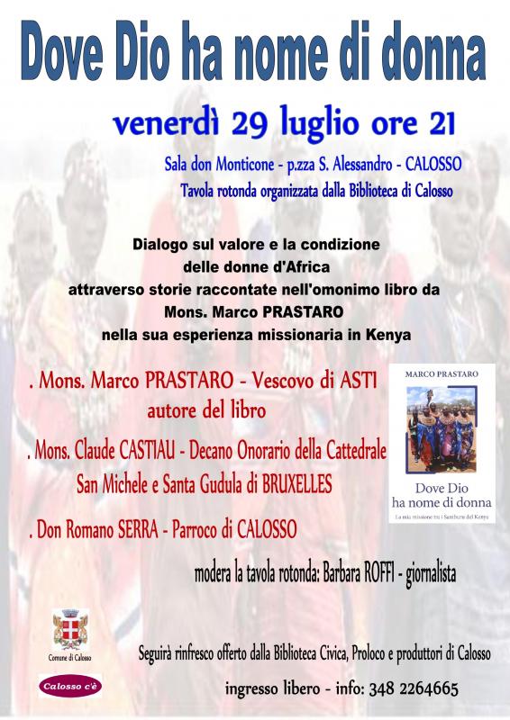 Venerdì 29 luglio l’appuntamento è per le ore 21 alla Sala don Monticone, con una tavola rotonda organizzata dalla biblioteca di Calosso; “Dove Dio ha nome di donna” è il titolo della serata di dialogo sul valore e la condizione delle donne d’Africa, attraverso storie raccontate nell’omonimo libro da Mons. Marco Prastaro nella sua esperienza missionaria in Kenya. Saranno presenti Mons. Marco Prastaro, Vescovo di Asti, Mons. Claude Castiau, Decano Onorario della Cattedrale San Michele e Santa Gudula di Bruxelles e don Romano Serra, parroco di Calosso; a moderare, la giornalista Barbara Roffi. Al termine della serata ai partecipanti verrà offerto un rinfesco a cura della Biblioteca, della Pro Loco e dei produttori di Calosso. L’ingresso è libero. Info: tel. 348.2264665.