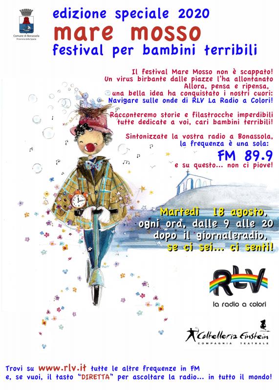 Anche quest'anno, anche se in forma ridotta, arriva Mare Mosso! Il Festival per bambini terribili vi raggiunge grazie alle onde di Radio Levanto che ospiterà per tutta la giornata il Festival e proporrà ogni ora favole, filastrocche e tanto altro dedicato ai più piccoli! Si potrà seguire tramite radio, App e sito di Radio Levanto! (locandina in allegato)