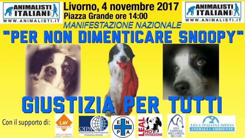 Le sette sigle animaliste danno appuntamento a Livorno, a partire dalle ore 14:00 di sabato 4 novembre. Una mobilitazione globale per chiedere giustizia per Snoopy, il cui assassino è stato condannato solo ai servizi sociali, e per tutte le altre creature cadute sotto la mano dell’uomo