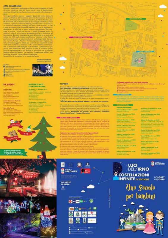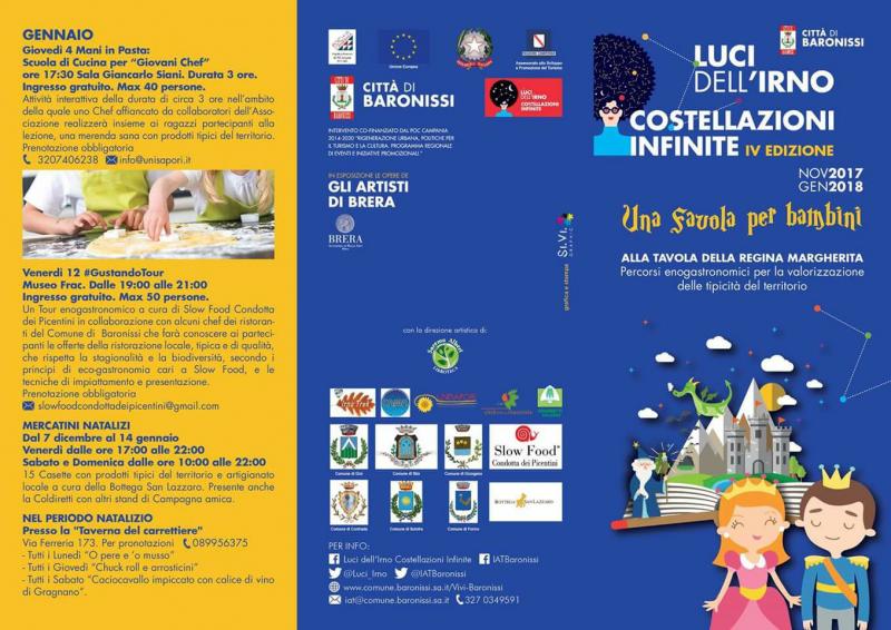 Baronissi, impegnata a realizzare un'offerta turistica integrata, si rivela al turista, come una città "del buon vivere", ricca di testimonianze storiche e di luoghi d'arte che esprimono una vivacità culturale sorprendente. Come punti stellari si aprono i suggestivi casali del centro storico, le austere architetture del trecentesco Convento francescano, la Domus Romana, il Museo d'arte contemporanea Frac, la villa e i parchi, i graffiti di Overline Jam, le testimonianze di archeologia industriale, il parco avventura, i percorsi collinari di trekking, mountainbike e a cavallo, in un itinerario di bellezza e paesaggi, tra storia, saperi e sapori. La città si apre al turista non per un transito frettoloso, ma per un soggiorno di esperienze e di valori per un vero e proprio coinvolgimento, per conoscere e scoprire i vicoli più nascosti, i luoghi di interesse storici, le tradizioni culturali e le proposte enogastronomiche tra tradizione ed innovazione. Baronissi si pone come un punto d'incontro tra la costa e la collina, tra il blu delle costiere amalfitana e cilentana - che distano pochissimi chilometri - e i più importanti siti archeologici della Campania, in primis Pompei e Paestum. Per la sua posizione privilegiata, che la fa centro di soggiorno ideale per visitare le più importanti località d'arte della Campania, Baronissi si offre come cittadina contemporanea a dimensione delle famiglie e dei bambini. L'attenzione ai più piccoli, ben evidenzata dalla presenza in città di numerosi parchi giochi e aree attrezzate ad essi dedicati, si arricchisce con la proposta natalizia offerta dall'evento " Luci dell'Irno - Costellazioni Infinite - una favola per bambini", giunto alla quarta edizione. Saremo felici di accogliervi in un mondo da favola.