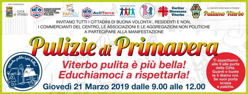 Il Comitato spontaneo cittadino "Puliamo Viterbo - 21 marzo 2019" è lieto di presentare i dettagli organizzativi dell'evento PULIZIE DI PRIMAVERA, che si svolgerà Giovedì 21 Marzo 2019 dalle ore 9 alle ore 12 nel centro storico della Città di Viterbo.