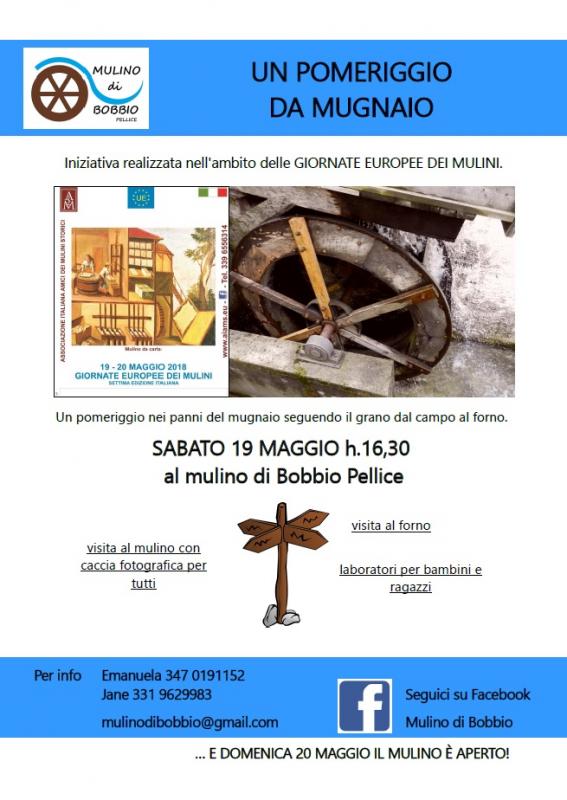 Per la prima volta quest’anno, il mulino di Bobbio Pellice aderisce alle Giornate europee dei mulini, organizzate nella loro settima edizione italiana per sabato 19 e domenica 20 maggio; sul nostro territorio nazionale, esse coinvolgono alcune decine di opifici ad acqua distribuiti in quasi ogni Regione.