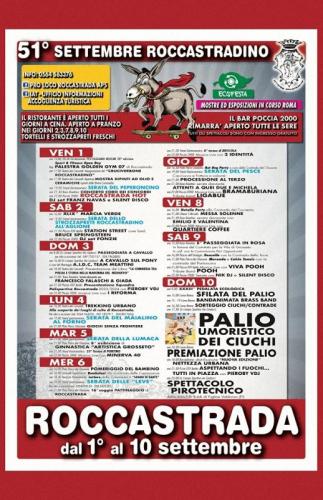 Roccastrada si prepara ad accogliere la 51esima edizione del Settembre Roccastradino con dieci giorni di tradizioni, sport, sapori tipici e animazione da Venerdì 01 a Domenica 10 Settembre, giorno del gran finale con il “Palio umoristico dei ciuchi” che anche quest’anno si svolgerà nella cornice dell’ex campo sportivo di Via Carducci che farà da palcoscenico anche all'evento di chiusura dei festeggiamenti, il tradizionale spettacolo pirotecnico.