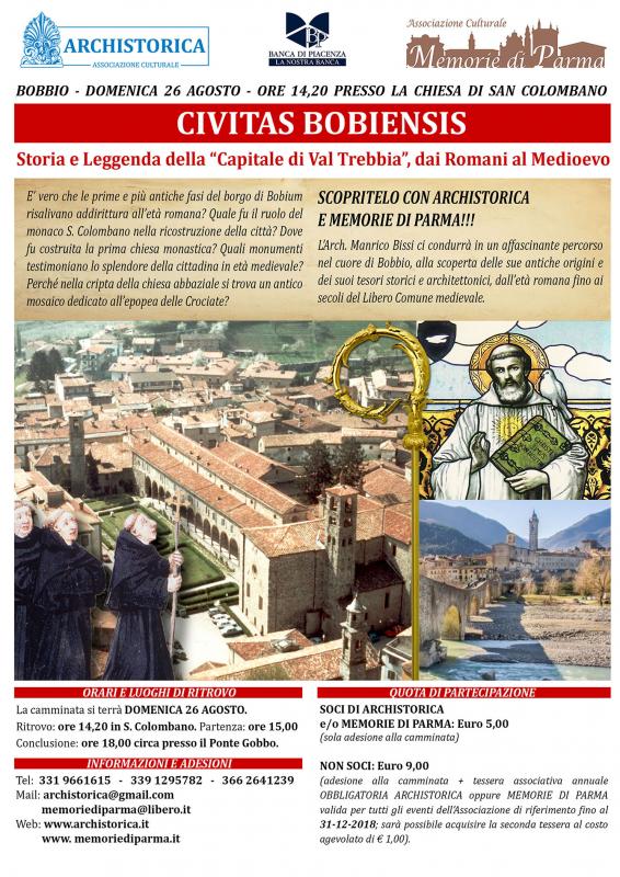 Si terrà DOMENICA 26 AGOSTO la camminata di fine estate sul tema “CIVITAS BOBIENSIS”, dedicata all’Arte, alla Storia e alle memorie leggendarie della splendida città di Bobbio, antica “Capitale della Val Trebbia” dai Romani al Medioevo.