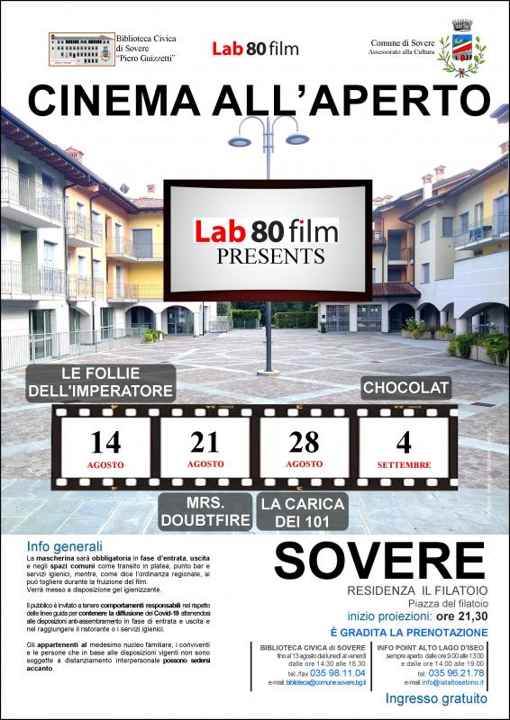 L'Assessorato alla Cultura e la Biblioteca civica "Piero Guizzetti" di Sovere, in collaborazione con la società cooperativa "Lab 80 film", propongono una rassegna di cinema all'aperto tutti i venerdì dal 14 agosto al 4 settembre 2020 presso la Piazza del Filatoio di Sovere.