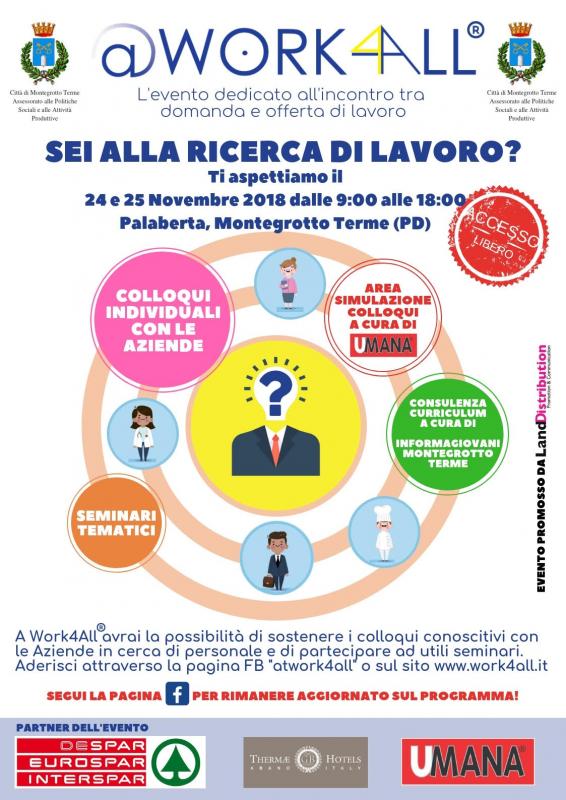 Sei alla ricerca di lavoro? @Work4All ti aspetta il 24 e 25 Novembre 2018 a Montegrotto Terme dalle 9:00 alle 18:00, presso il Palaberta.