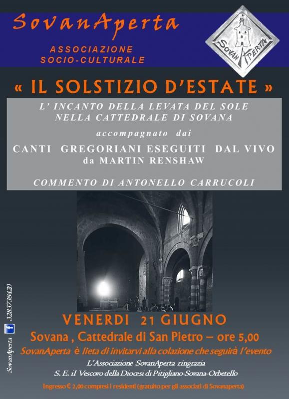 L’associazione culturale SovanAperta organizza a Sovana (Comune di Sorano, Grosseto), nella Cattedrale romanica dei Santi Pietro e Paolo di Sovana (XIII secolo d.C), venerdì 21 giugno alle ore 5 di mattina, il “Solstizio d’estate”. Un suggestivo ed emozionante concerto all’alba di Canti Gregoriani seguiti dal vivo da Martin Renshaw, cantore della cattedrale di Canterbury, con il commento di Antonello Carrucoli.