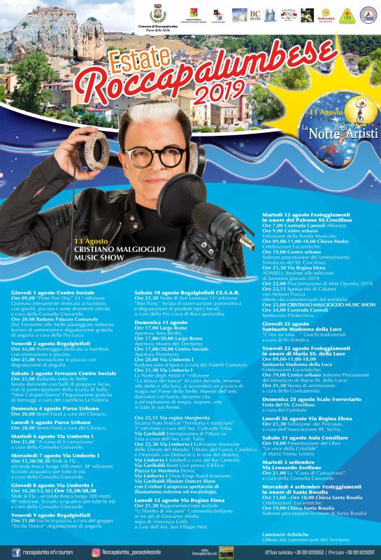 Turismo, spettacolo, arte, cultura, musica, un mix di eventi pensati per far divertire tutti: ne sono esempio lo “Slide and Fly”, uno scivolo acquatico per tutte le età, nei giorni 7 e 8 Agosto, lo “Star Party” in occasione della Notte di San Lorenzo, le visite guidate presso le strutture astronomiche e museali. Tra gli eventi visionabili nel programma i festeggiamenti in onore del SS. Crocifisso, Patrono di Roccapalumba, che inizieranno già giorno 11 Agosto, con la 4° edizione de “La Notte degli Artisti”, una notte che celebra l’arte in tutte le sue forme: dalla musica alla fotografia, dall’arte di strada all’illusionismo. Street band, illusionisti, estemporanee di pittura, mostre ed esibizioni saranno il cuore di questo evento. La vigilia della festa, il 12 Agosto, andrà in scena la commedia brillante “U librettu di me patri”, a cura dell’Associazione San Filippo Neri.