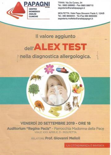 Venerdì 20 settembre 2019 ore 18.00, presso l’Auditorium Regina Pacis, parrocchia Madonna della Pace Molfetta, Viale XXV aprile n. 3, il professor Giovanni Melioli, allergologo di fama internazionale presso l’Istituto Clinico Humanitas di Rozzano (Mi), parlerà della diagnostica allergologica e dell’impiego dell’Alex Test mediante il quale è possibile ricercare 282 allergeni (pollini, graminacee, alimenti ecc.) con un unico prelievo di sangue.