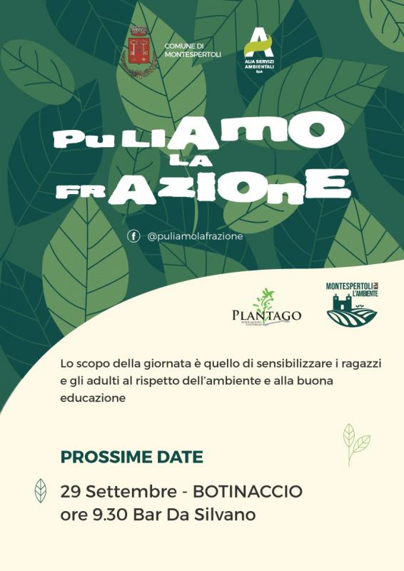 Nonostante l'allerta meteo codice arancione non abbia permesso lo svolgimento del primo evento organizzato dall'Amministrazione Comunale insieme a diverse associazioni del territorio, le prossime tre domeniche vedranno alcune frazioni del Comune di Montespertoli interessate da "Puliamo la frazione", la camminata "ecologica" in cui la comunità di Montespertoli si trova a pulire i ciglioni stradali e le aree verdi dai rifiuti abbandonati. "Puliamo la frazione è una delle iniziative più belle" dichiara Marco Pierini, Vicesindaco e Assessore all'Ambiente. "Abbiamo coinvolto moltissime Associazioni del capoluogo e delle frazioni, così come gli studenti delle nostre scuole, per dire che l'ambiente e la pulizia del territorio ci stanno a cuore. Questa iniziativa rientra nella cornice più ampia di 'Montespertoli per l'Ambiente', il contenitore delle iniziative comunali di sensibilizzazione sui temi ambientali" Un nuovo calendario è già pronto: domenica 29 Settembre si svolgerà a Botinaccio, l'incontro è alle 9.30 al Bar da Silvano.