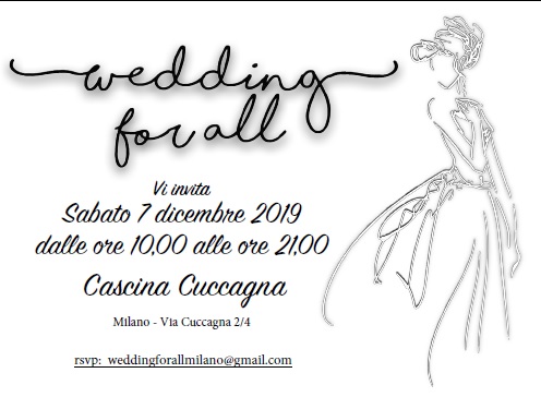 Appuntamento con il primo Wedding for All, sabato 7 dicembre 2019, dalle ore 10.00 alle ore 21.00 a Cascina Cuccagna, via Cuccagna 2/4, angolo Via Muratori, in zona Porta Romana, a 5 minuti da MM Lodi, dotata di free wi-fi, angolo bar e, per i più golosi, anche del ristorante “Un Posto a Milano”, presente sulla guida Michelin. Vi aspettano momenti di eleganza, intrattenimento, gustosi assaggi e uno speed-date dedicato a chi vuole organizzare al meglio il proprio matrimonio ma è ancora alla ricerca dell’anima gemella!