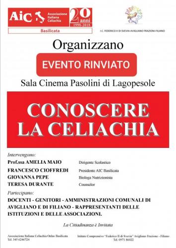 Informiamo i lettori che l'evento dal titolo "Conoscere la Celiachia" , in programma per lunedì 02 marzo presso la Sala Cinema Pasolini di Lagopesole, è stato RINVIATO a data da destinarsi.