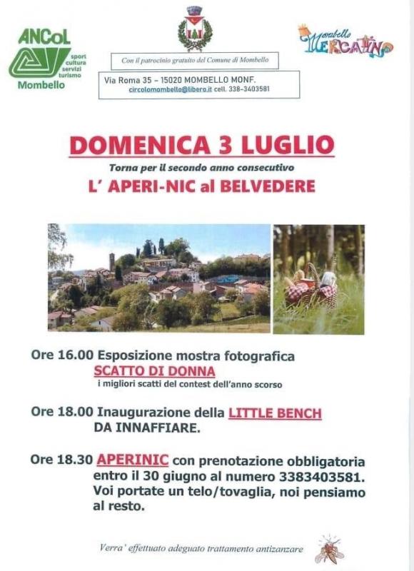 Dopo il rinvio di fine maggio dovuto ad un evento imprevedibile, viene riproposto domenica 3 luglio al pomeriggio l'Aperi-Nic al Belvedere di Mombello Monferrato organizzato dal Circolo Ancol in collaborazione con il Mercatino e con il patrocinio dell'Amministrazione Comunale.