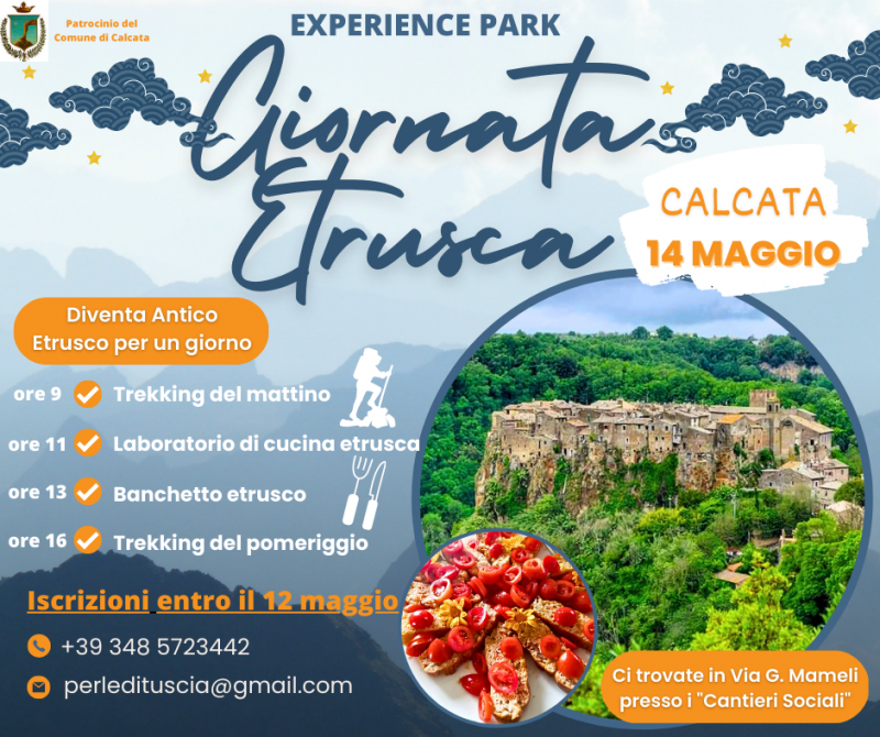 Con piacere vi aspettiamo a 𝗖𝗔𝗟𝗖𝗔𝗧𝗔, a metà strada tra Roma e Viterbo, in terra di etruschi e falisci, per la 𝗚𝗜𝗢𝗥𝗡𝗔𝗧𝗔 𝗘𝗧𝗥𝗨𝗦𝗖𝗔 che si svolgerà il 14 MAGGIO per un'esperienza emozionale indimenticabile.