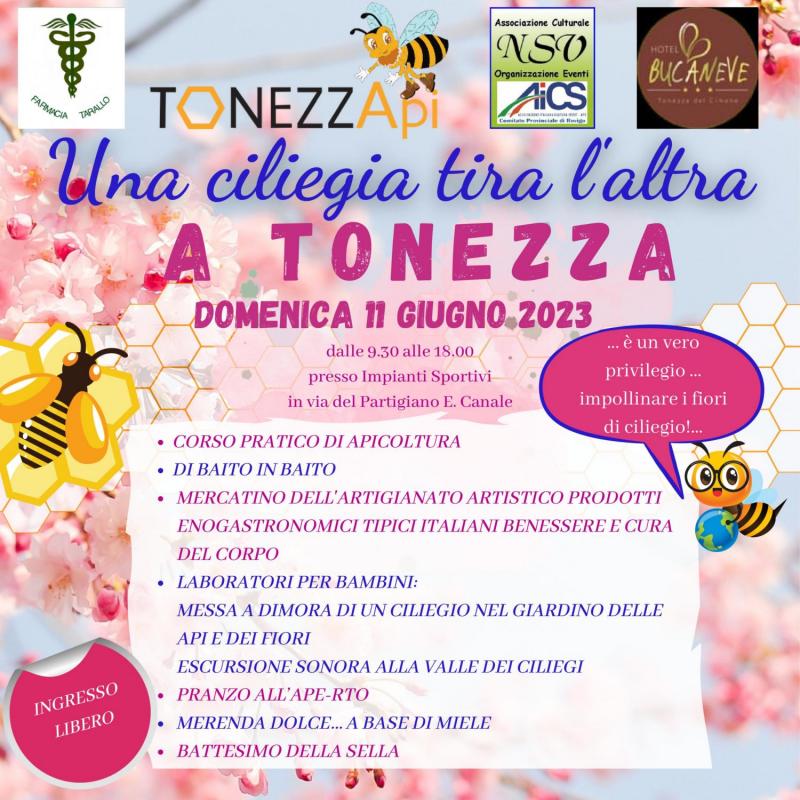 L'Associazione TonezzApi, in collaborazione con l'Associazione Culturale NSV Organizzazione Eventi APS affiliata A.I.C.S. - Comitato Provinciale di Rovigo, organizzano per Domenica 11 Giugno 2023, a Tonezza del Cimone (VI), in Via del Partigiano E. Canale (zona Impianti Sportivi) dalle ore 09:30 alle ore 18:00 la Manifestazione "Una Ciliegia tira l'altra" che prevede il seguente programma: