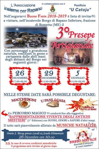 L'Associazione "Insieme per Rapano" è lieta di invitarvi a visitare, nell'incantevole borgo di Rapano Inferiore, frazione di Rometta (ME), il 3° Presepe Artigianale.