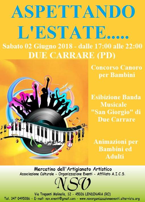 La Pro Loco di Due Carrare (PD) in collaborazione con l'Associazione Culturale NSV Organizzazione Eventi affiliata A.I.C.S. - Comitato Provinciale di Rovigo, organizzano per Sabato 02 Giugno 2018 a Due Carrare (PD), nelle Piazzette antistanti al Comune in Via Roma dalle ore 17:00 alle ore 22:00, il Mercatino della Manifestazione "Aspettando l'Estate”, che prevede la presenza di Espositori delle Tradizioni Popolari, dell'Artigianato Artistico e delle Opere d'Ingegno Creativo con Curiose ed introvabili Idee Regalo per la Casa ed il Tempo Libero; Prodotti e Rimedi Naturali per la Cura del Corpo e del Vivere Sano.Il programma della Manifestazione prevede il Concorso Canoro per Bambini; l'Esibizione della Banda Musicale San Giorgio; Animazioni varie per Bambini e Adulti.