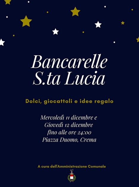 Mercoledì 11 e Giovedì 12 Dicembre 2019 a Crema tornano le bancarelle di Santa Lucia dei nuovi Mercatini di Natale: l’appuntamento tradizionale con le bancarelle di dolci, specialità gastronomiche, artigianato, giocattoli in attesa di Santa Lucia.