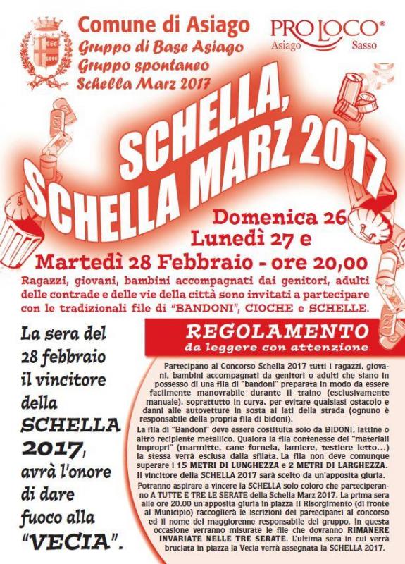 Nelle sere del 26, 27 e 28 febbraio, in Piazza II Risorgimento e per le vie del centro, si svolgerà la tradizionale serata di Schella Marz, con la sfilata dei "bandoni" e il rogo della "vecia".