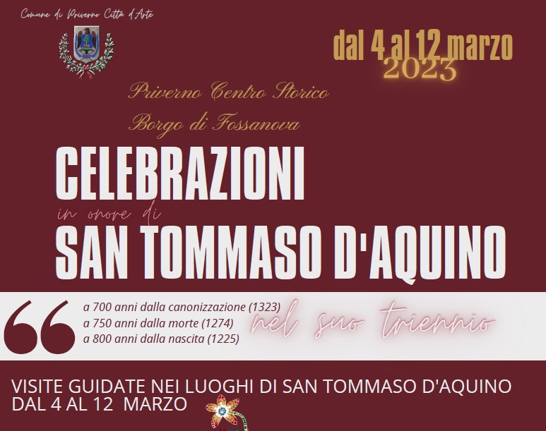 Dopo la firma dell’Accordo per la valorizzazione dell'Abbazia, del Borgo e del Museo Medievale di Fossanova e dei luoghi della cultura tomistici di Priverno, tra la direzione Regionale dei Musei del Lazio, la Soprintendenza competente, la Curia e le Parrocchie interessate, con le celebrazioni dell’anniversario della morte di San Tommaso D’Aquino, inizia il programma di festeggiamenti in suo onore, che coinvolgerà la città in numerosi eventi, lungo tutto il triennio 2023-2025, che celebra il centenario della canonizzazione (1323), della morte (1274) , della nascita (1225) del Santo.