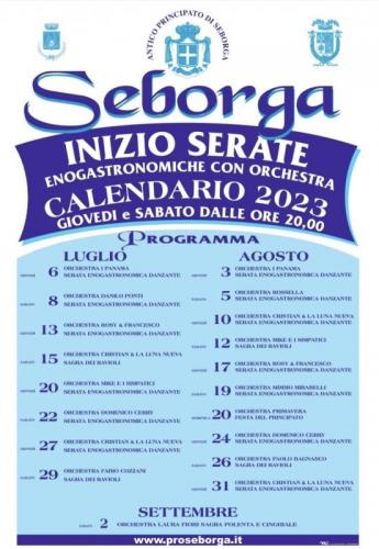Dal 6 Luglio al 2 settembre 2023 iniziano gli eventi a Seborga con serate enogastronomiche danzanti che vi accompagneranno tutti i Giovedì e i Sabato sera dalle ore 20.00 dei mesi di Luglio, di Agosto, e fino al 8 di Settembre.