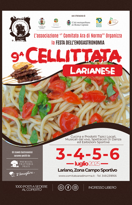 L’Associazione “Comitato Ara di Norma” con sede in Lariano via Algidus nr.185, organizza la IX^ manifestazione della Festa dell’Enogastronomia denominata “Cellittata Larianese”.