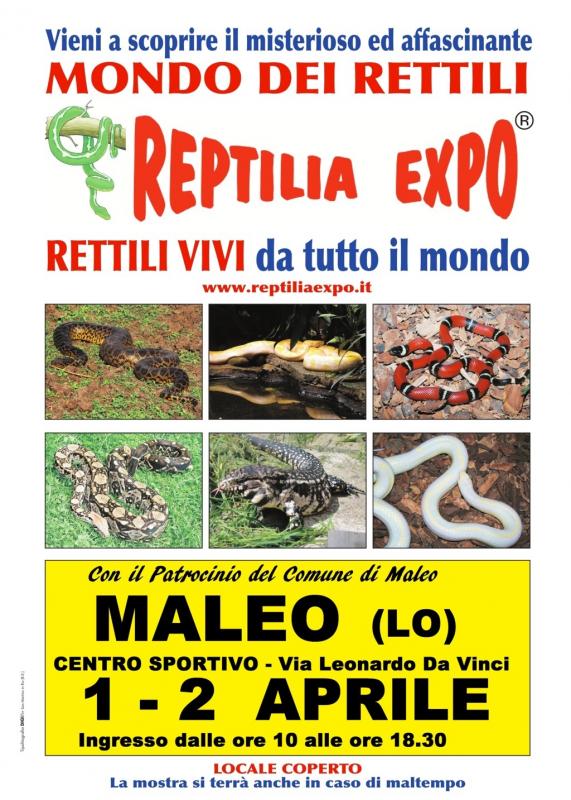 Reptilia Expo - l'affascinante mondo dei rettili al Centro Sportivo di MALEO (Viale Leonardo Da Vinci) nelle giornate di sabato 1 e domenica 2 Aprile propone una interessantissima Mostra in cui, con orario dalle ore 10 alle ore 19, si potranno ammirare, contenuti all'interno di tanti terrari, moltissimi serpenti tra i più belli ed affascinanti.