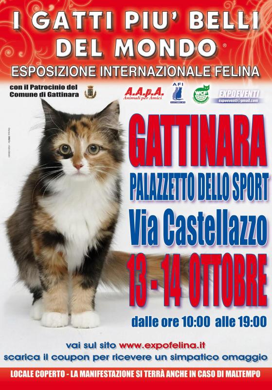 A GATTINARA (VC) presso il Palazzetto dello Sport in Via Castellazzo nei giorni di sabato 13 e domenica 14 Ottobre, orario dalle ore 10 alle ore 19, si svolgerà l'Esposizione Internazionale Felina "I GATTI PIU' BELLI DEL MONDO" con la partecipazione di centinaia di gatti di razza che, sotto l'egida dell'Associazione Felina Italiana, verranno giudicati da Giudici Internazionali WCF (World Cats Federation) nel Best in Show in programma al pomeriggio di entrambe le giornate.