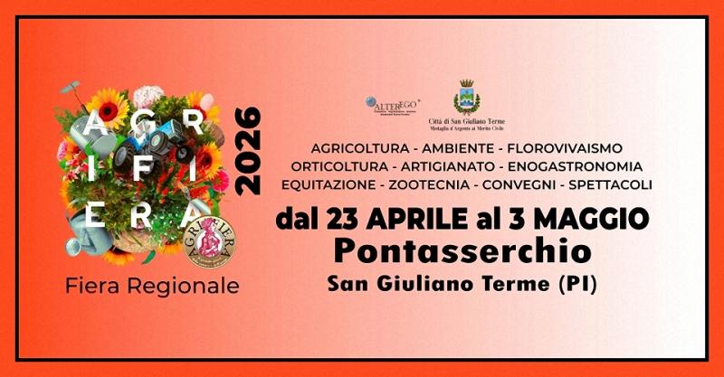 A Pontasserchio, frazione del Comune di San Giuliano Terme si svolge nei giorni dal 23 Aprile al 03 Maggio 2026 la manifestazione Agrifiera.