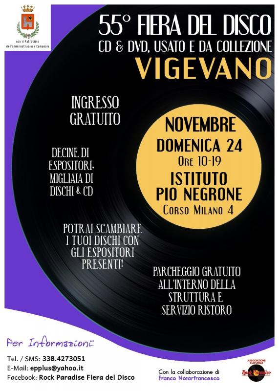Vi informiamo che Domenica 24 Novembre a VIGEVANO C/O l’Istituto Pio Negrone, Corso Milano 4, l’Associazione Culturale Rock Paradise, con il patrocinio del comune di VIGEVANO, organizzerà la sua 55° Fiera del Disco.