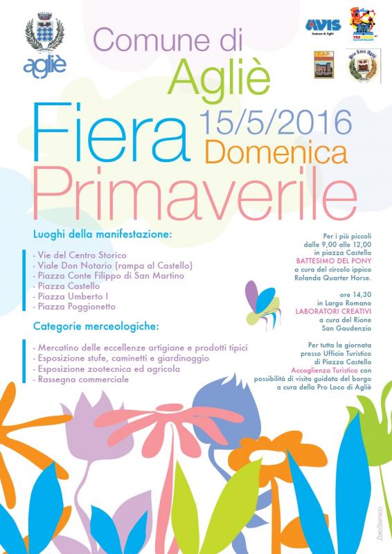 Domenica 15 maggio si terrà ad Agliè la tradizionale Fiera di Primavera, organizzata dal Comune di Agliè in collaborazione con le Associazioni AVIS e CAP (commercianti, artigiani, produttori).