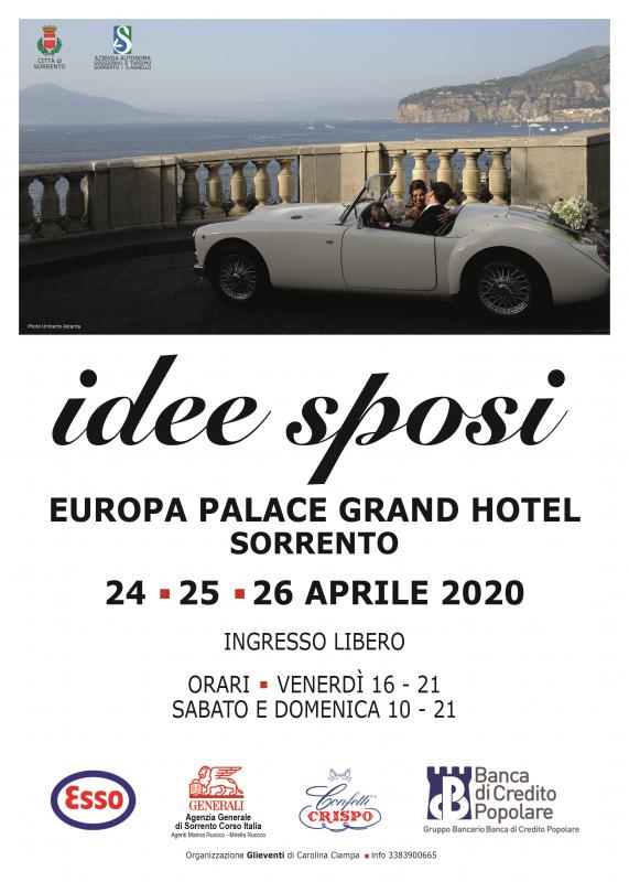 La diciannovesima edizione dell'elegante salotto fieristico “Idee Sposi” si svolgerà nel prestigioso Europa Palace Grand Hotel Sorrento da venerdì 24 a domenica 26 Aprile 2020, con ingresso libero ai visitatori .Viva l'amore! Nella terra dell'arte della tradizione e della cultura, i protagonisti sarete Voi con il vostro amore in una cornice di straordinaria bellezza, con i vostri sogni e desideri da realizzare per questo giorno magico. La serenità e lo stile dell'organizzazione del vostro matrimonio è l'obbiettivo principale di professionisti consolidati che garantiranno la qualità.