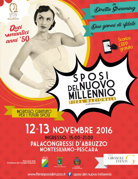 Il 12 ed il 13 novembre l’Agenzia “Girasole Eventi” organizza in esclusiva la XVIII edizione di “Sposi del Nuovo Millennio”, la manifestazione fieristica più attesa dalle coppie dell’intero Centro Italia, in programma al Palacongressi d’Abruzzo di Montesilvano.