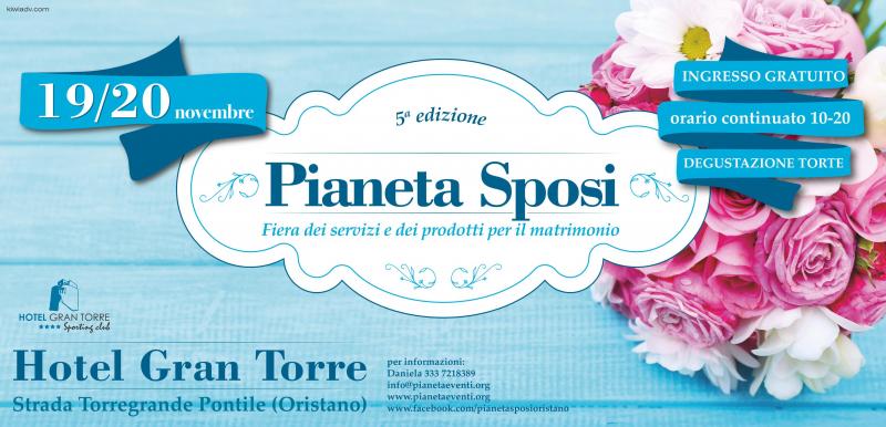 19 e 20 NOVEMBRE 2016. Giunta alla sua 5° edizione, come ogni anno PIANETA SPOSI “La fiera dei servizi e dei prodotti per il matrimonio ad Oristano” riunisce le migliori aziende del settore MATRIMONIO. La rassegna quest'anno è ospitata dall'esclusiva location Hotel Gran Torre a Torregrande (OR).