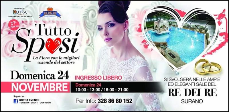Domenica 24 NOVEMBRE 2019, presso la splendida sala ricevimenti “RE DEI RE” a Surano, si terrà la ventisettesima edizione di Tutto Sposi, la fiera del wedding.