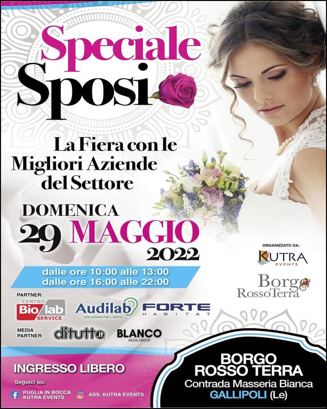 Presso Borgo Rosso Terra in Contrada Masseria Bianca a Gallipoli in provincia di Lecce si svolge nella giornata di Domenica 29 Maggio 2022, dalle ore 10.00 alle ore 13.00 e dalle ore 16.00 alle ore 22.00, la Fiera degli Sposi "Speciale Sposi".