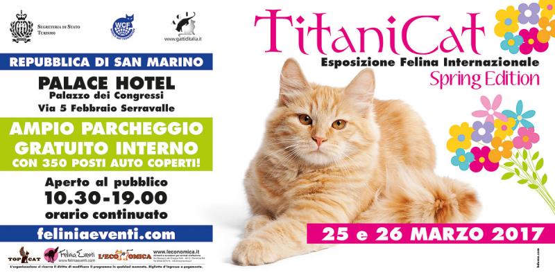 Nella prestigiosa Repubblica del Titano va in scena l’Edizione Primaverile di TITANICAT 2017 Spring Edition, l’Esposizione Felina Internazionale a cura di Felinia Eventi e patrocinata da AGI (Associazione Gatti d’Italia) e da WCF (World Cat Federation), con il patrocinio della Segreteria di Stato Turismo della Repubblica di San Marino, Sabato 25 e Domenica 26 Marzo 2017, esposizione che si terrà presso il Centro Congressi del Palace Hotel Best Western (Serravalle di San Marino)