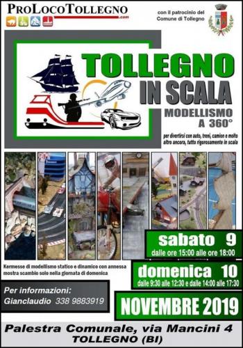 Tollegno in Scala, si terrà a Tollegno (BIELLA) il Sabato 09 Novembre 2019 dalle ore 15,00 alle 18,00. Domenica 10 Novembre dalle ore 9,30 alle 12:30 e dalle 14:00 alle 17:30 presso la palestra comunale in via Mancini 4, due giornate di modellismo dinamico e statico, con annessa mostra scambio (solo la Domenica), si potranno vedere macchine, treni, camion e tante altre cose tutto rigorosamente in scala tutti i modelli saranno sia statici che dinamici, ristoro in loco.