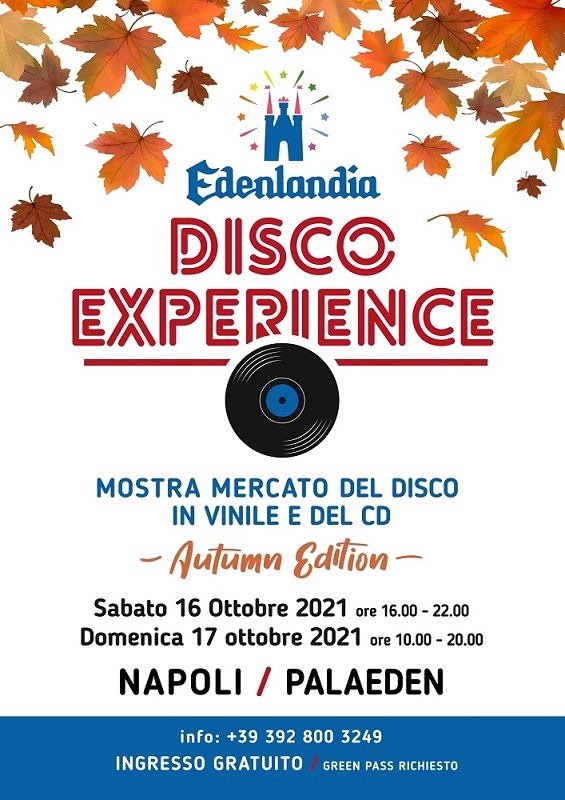La più grande fiera del Disco del Sud Italia ritorna a Napoli: al parco divertimenti Edenlandia. L'imperdibile fiera del vinile e del cd si terrà anche questa volta per l'edizione autunnale al PalaEden. Sabato 16 ottobre 2021 ore 16.00 - 22.00 e Domenica 17 ottobre 2021 ore 10.00 - 20.00, ingresso gratuito.