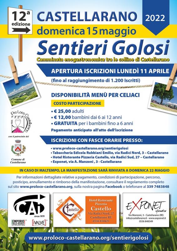 Sentieri Golosi è una camminata non competitiva che si snoda tra natura ed enogastronomia su un percorso di circa 14 km sulle splendide colline di Castellarano. Durante il percorso i partecipanti troveranno punti di ristoro con assaggi di