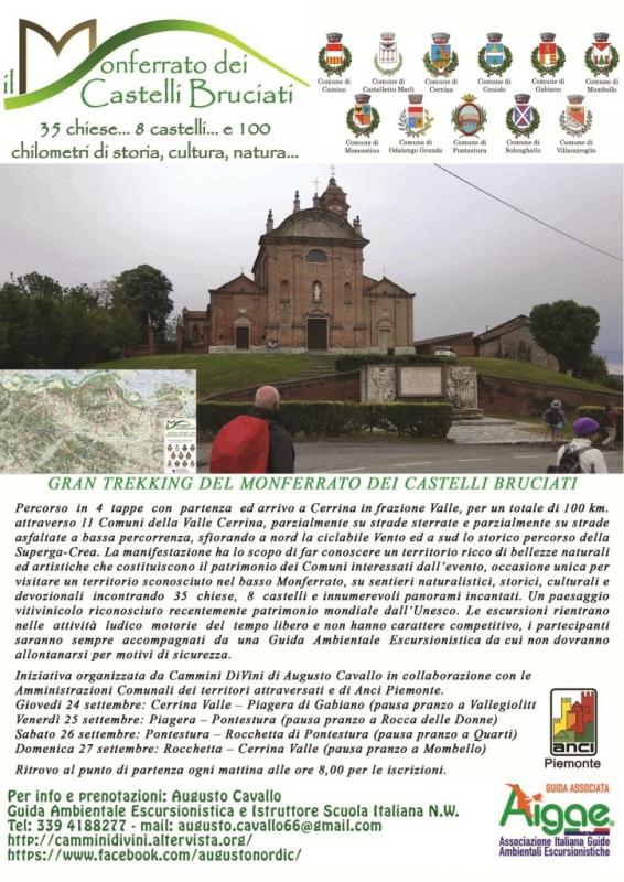 Percorso in 4 tappe con partenza ed arrivo a Cerrina in frazione Valle, per un totale di 100 km. attraverso 11 Comuni della Valle Cerrina, parzialmente su strade sterrate e parzialmente su strade asfaltate a bassa percorrenza, sfiorando a nord la ciclabile Vento ed a sud lo storico percorso della Superga-Crea. La manifestazione ha lo scopo di far conoscere un territorio ricco di bellezze naturali ed artistiche che costituiscono il patrimonio dei Comuni interessati dall’evento, occasione unica per visitare un territorio sconosciuto nel basso Monferrato, su sentieri naturalistici, storici, culturali e devozionali incontrando 35 chiese, 8 castelli e innumerevoli panorami incantati. Un paesaggio vitivinicolo riconosciuto recentemente patrimonio mondiale dall’Unesco. Le escursioni rientrano nelle attività ludico motorie del tempo libero e non hanno carattere competitivo, i partecipanti saranno sempre accompagnati da una Guida Ambientale Escursionistica da cui non dovranno allontanarsi per motivi di sicurezza.