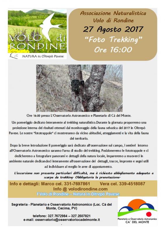 Un pomeriggio dedicato interamente al trekking naturalistico. Durante la giornata proporremo una proiezione interna dei risultati ottenuti dal monitoraggio della fauna selvatica del 2017 in Oltrepò Pavese.