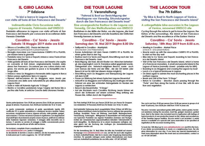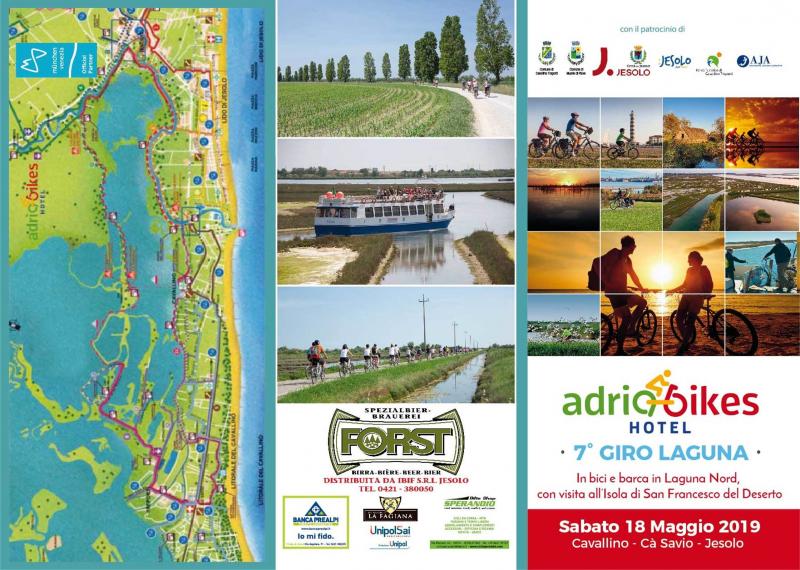 Sabato 18 Maggio 2019 si terrà a Jesolo e nella Laguna di Venezia, la 7a edizione del “GiroLaguna©: in bici e barca, con visita all'Isola di San Francesco del Deserto” una piacevole ciclo escursione nei siti Patrimonio dell’Unesco, per pedalare nel paesaggio straordinario della Laguna, tra l’intreccio di canali, argini, valli da pesca e campi coltivati, da Cavallino Treporti a Lio Maggiore e Jesolo.