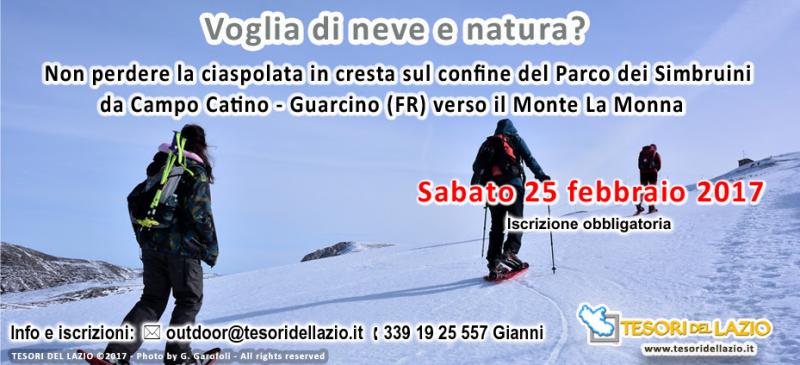 Nuovo itinerario Outdoor di montagna, aperto a tutti, grandi e ragazzi abituati all’ambiente severo della montagna invernale e dotati di un minimo di attrezzatura invernale, per sabato 25 febbraio pv per una ciaspolata in cresta lungo le vette più meridionali del Parco Naturale Regionale dei Monti Simbruini e le propaggini degli Ernici, che si svolgerà nel territorio di Guarcino (FR) al limite del confine regionale tra Lazio e Abruzzo.