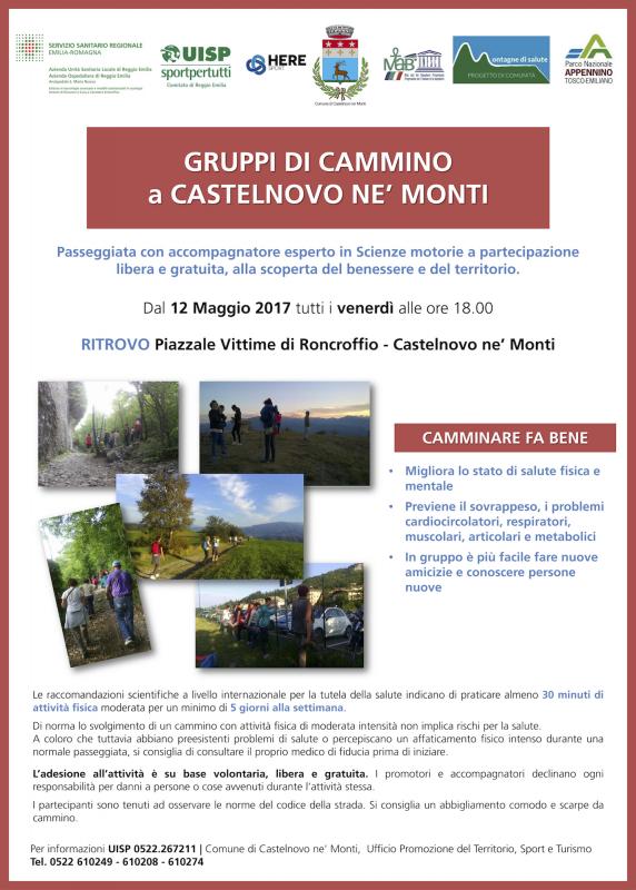 CASTELNOVO MONTI – Tornano a Castelnovo i Gruppi di Cammino, organizzati dall'Assessorato all'Ambiente, in collaborazione con Ausl e Azienda ospedaliera Santa Maria Nuova, e con il comitato Uisp di Reggio, nell'ambito del progetto di promozione del benessere “Montagne di Salute. A partire dal prossimo 12 maggio prenderà il via una serie di passeggiate, ogni venerdì alle ore 18, con accompagnatore esperto in scienze motorie, a partecipazione libera e gratuita per tutti, alla scoperta del benessere e del territorio. Ci si ritroverà ogni settimana nel piazzale Vittime di Roncroffio, (il parcheggio “sopra” alla rotatoria dell'Albiaccio). “Dopo la prima edizione dello scorso anno – afferma l'Assessore al Turismo, Chiara Borghi – riprendiamo il progetto dei Gruppi di Cammino, che porta avanti alcuni semplici ma fondamentali indicazioni per la salute. A partire dal fatto assodato che camminare fa bene: moltissimi studi scientifici confermano che migliora lo stato di salute fisica e mentale, previene il sovrappeso, i problemi cardiocircolatori, respiratori, muscolari, articolari e metabolici. Camminare in gruppo, inoltre, è meno faticoso, consente di fare amicizie e conoscere persone nuove”. Conclude l'Assessore Borghi: “Le raccomandazioni scientifiche a livello internazionale per la tutela della salute indicano di praticare almeno 30 minuti di attività fisica moderata per un minimo di 5 giorni alla settimana. Lo svolgimento di un cammino con attività fisica di moderata intensità non implica alcun rischio per la salute. L'adesione ai Gruppi di Cammino è su base volontaria, libera e gratuita. Si consigliano un abbigliamento comodo e scarpe da cammino”.