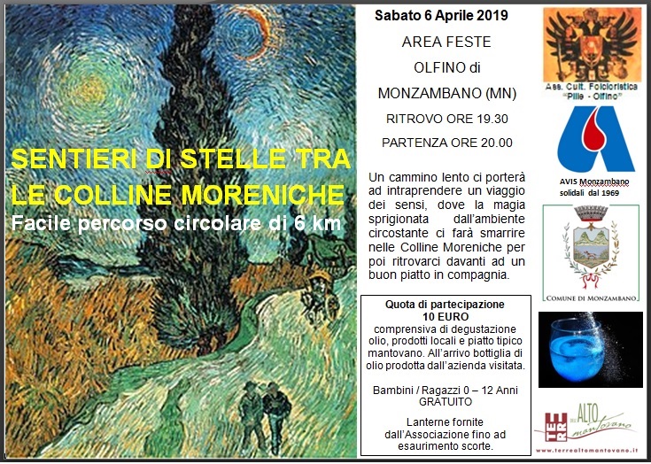 Sabato 6 aprile 2019 alle ore 19.30 presso l’Area Feste ad Olfino di Monzambano si terrà la nuova edizione di “Sentieri di stelle”: facili percorsi alla scoperta del territorio delle Colline Moreniche e delle realtà produttive della zona.