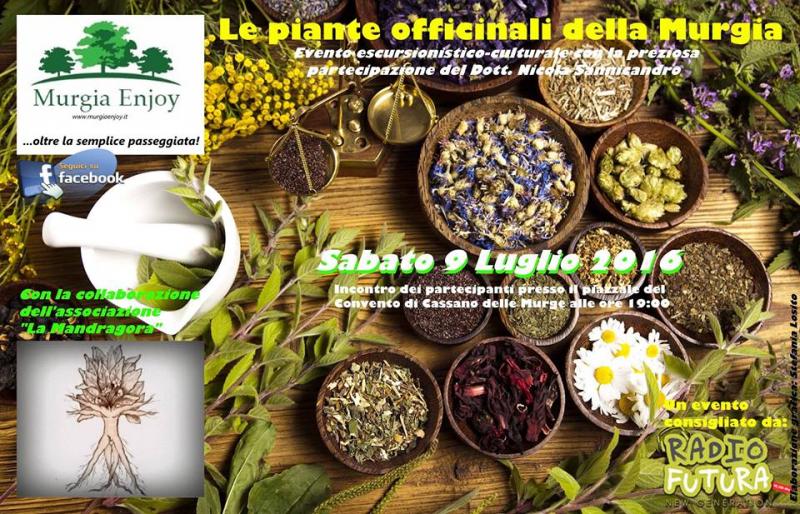Dopo aver proposto in passato gli importanti eventi "MangiareMurgia" e "Le tisane con le erbe della Murgia" per far comprendere l'elevata importanza di alcuni "doni" del nostro territorio, l'associazione culturale Murgia Enjoy propone per sabato 9 Luglio l'evento escursionistico-culturale "Le piante officinali della Murgia".